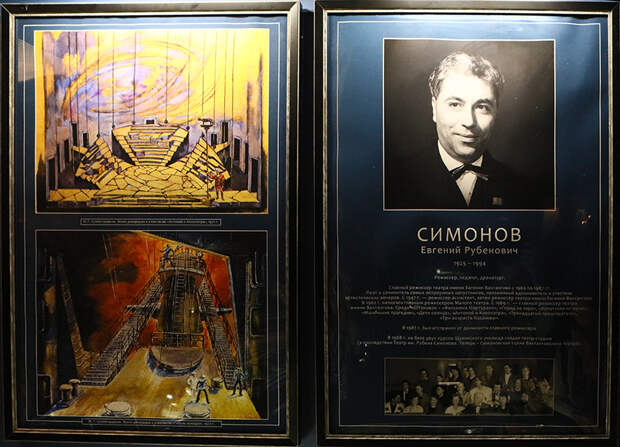 Во втором зале - «Время в движении» знакомимся с историей здания театра Вахтангова. Нас усаживают на круговой диван, который медленно вращается, и мы оказываемся зрителями документального фильма. На экране виды Москвы, конкретно - того самого места, где возвышается Театр Вахтангова, начиная с XVII века. В роли рассказчиков – Анна Дубровская и Юрий Поляк. Они погружают нас в период, начинающийся с дней Великой Отечественной и заканчивающийся днями сегодняшними. Им выпадает рассказать о самом страшном дне в истории Вахтанговского - о 24 июля 1941 года. В этот день в здание театра попала фугасная бомба и разрушила его. От взрывной волны погибли артисты Василий Куза и Николай Чистяков, курьер Павел Ланцов. Память о них бережно хранят... Важно отметить, что реставрационные работы в театре велись и во время войны. Премьера «Крепость на Волге» в постановке Рубена Симонова состоялась в ноябре 1949 года.