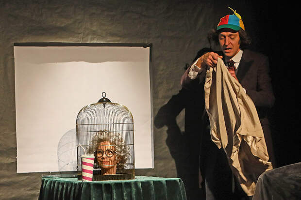 А дальше происходит невероятное: невидимым персонажам, которыми переполняется дом, становится тесно в их комнатах, и они начинают сквозь стены вламываться в гостиную, туда, где находят подобие мира, в который их поселили авторы. Страдающая молодая женщина... Мужчина в странном прикиде, непонятно зачем, устроивший свидание у высохшего дерева... Женщина, непонятно зачем, сюда пришедшая... А потом, разрушив целую стену, в гостиную ворвётся ветер с листами бумаги для стихов, а в следующий раз - с осенними листьями. Собственно, таков образ спектакля: он полон бурных фантазий и перемен. А ещё стихов Аполлинера в переводах создателей спектакля, которые хорошо поработали над вымышленным.